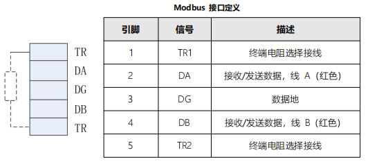 模塊使用自用2*5Pin歐式彈簧端子作為 Modbus RTU 通信的物理接口,其中兩個 TR 是終端電阻選接線。在內部模塊內部集成了 120Ω 的終端電阻。當 TR1 與 DA, TR2 與 DB 短接終端電阻有效。接口定義如下表所示