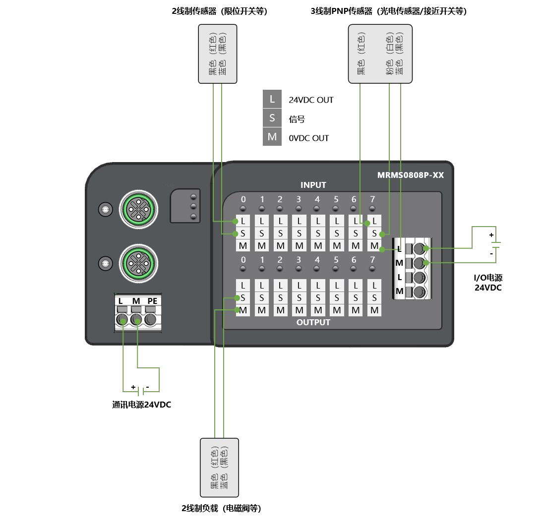 電源接口:模塊供電:3P歐式彈簧端子;負(fù)載供電:4P歐式彈簧端子