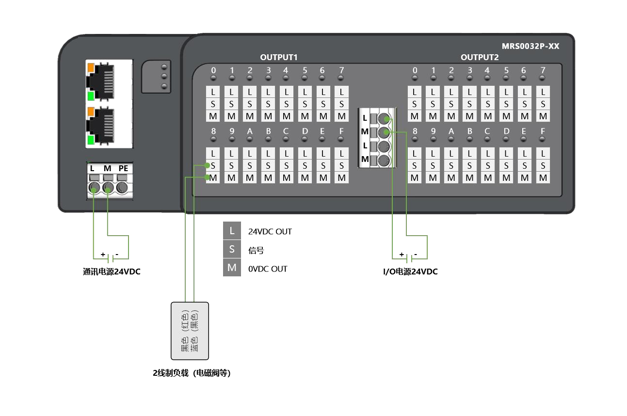 面板式快接線分布式I/O,CC-Link IE FiledBasic通訊,2xRJ45,可級聯;數字量32出 PNP,24VDC,0.5A,歐式彈簧端子;導軌安裝&打孔安裝(下單時需備注)